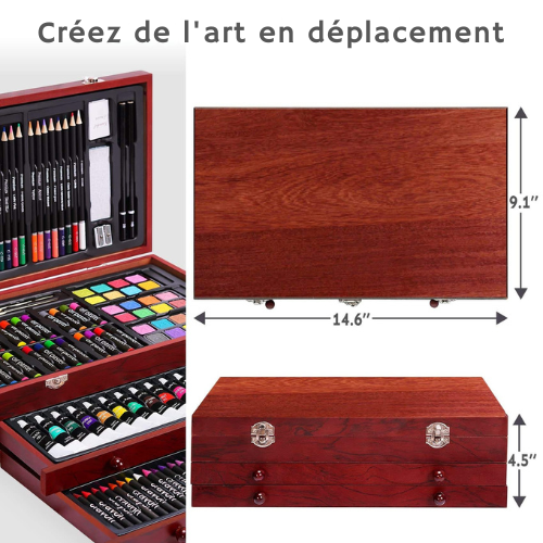 Son élégant coffret en bois façon acajou garde chaque outil parfaitement organisé et protégé. Le tiroir amovible et l’agencement spacieux permettent un accès facile à tout le matériel, idéal pour la maison, le studio, l’école ou les déplacements.