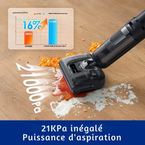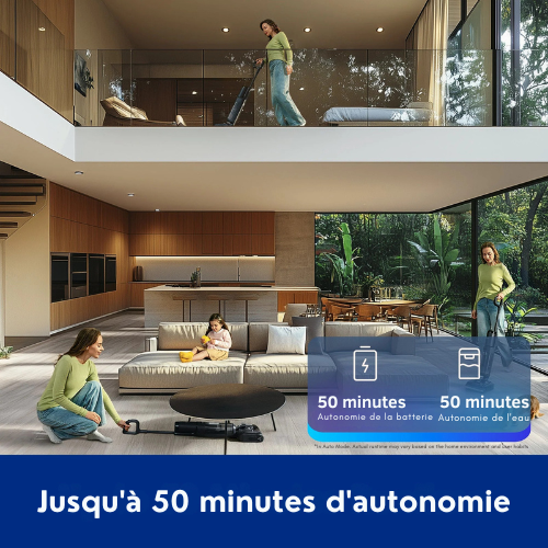 Propulsé par une batterie améliorée et optimisé par la technologie Floora™ SmartFlow, le S7 Ultra ajuste intelligemment le débit d’eau et la puissance de la batterie pour offrir jusqu’à 50 minutes d’autonomie. Cela permet un nettoyage continu sans perte d’aspiration — surpassant de nombreux modèles filaires ou sans fil, y compris les aspirateurs-laveurs robustes, pour des nettoyages rapides ou en profondeur.