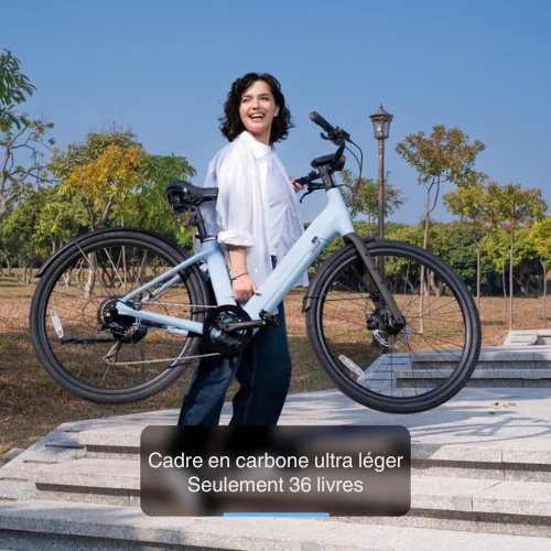 Grâce à son cadre 100% fibre de carbone, l’UrbanGlide™ Step-Thru est nettement plus léger que les vélos électriques en aluminium — environ 16,5 kg seulement. Le carbone offre une rigidité exceptionnelle, une résistance à la fatigue remarquable et un confort de conduite supérieur :