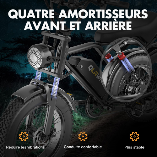 Profitez d’une conduite fluide sur l’asphalte, le gravier, le sable ou la neige grâce à la suspension hydraulique double et aux pneus larges 20 × 4.0 pouces. Le cadre en acier allié renforcé supporte jusqu’à 150 kg tout en offrant une maniabilité exceptionnelle. Que vous circuliez en ville ou sur les sentiers, VoltAero™ garantit une stabilité et un confort optimaux dans toutes les conditions.