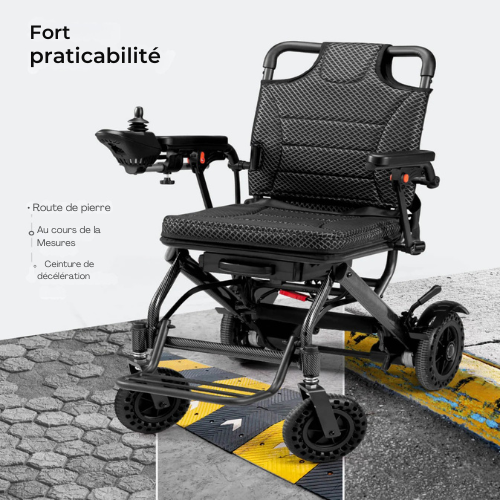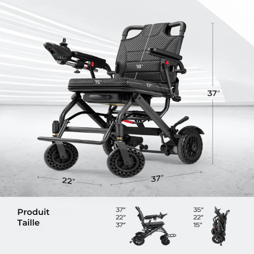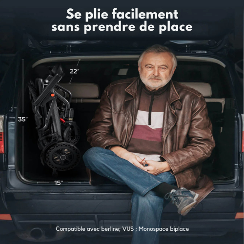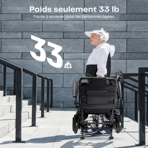 Avec un poids de seulement 15 kg (33 lb, sans batteries), ce fauteuil électrique est facile à manipuler et à transporter. Son système de pliage intelligent lui permet de se glisser aisément dans le coffre de la plupart des véhicules, simplifiant les déplacements, le rangement et le transport.