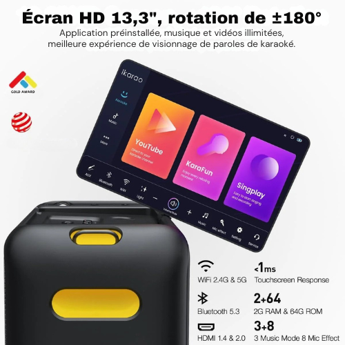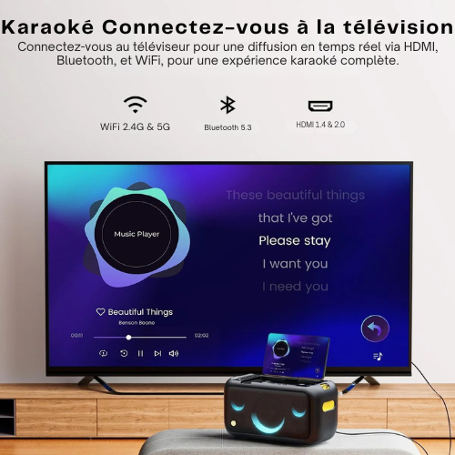 • Connectivité : HDMI, Bluetooth, USB, TF, AUX, MIC-IN, Guitar-IN