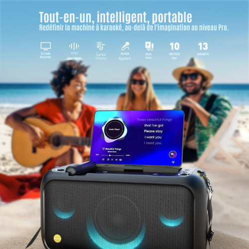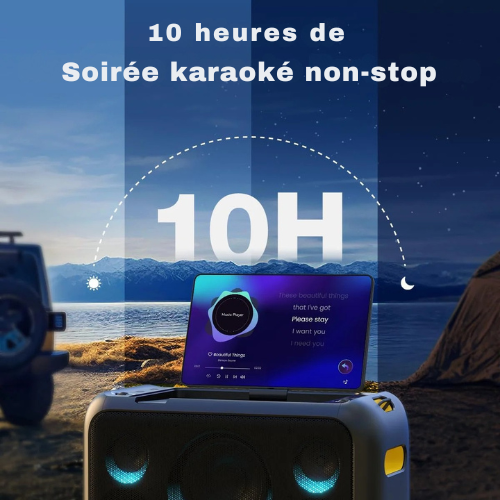 Transformez n’importe quel endroit en véritable scène. SonicStage™ est le premier système karaoké tout-en-un équipé d’un grand écran tactile, de haut-parleurs puissants et de deux microphones sans fil. Idéal pour les soirées à la maison, les événements, les fêtes en plein air ou les rassemblements entre amis, il offre un son puissant, des visuels immersifs et un contrôle simple et intuitif.