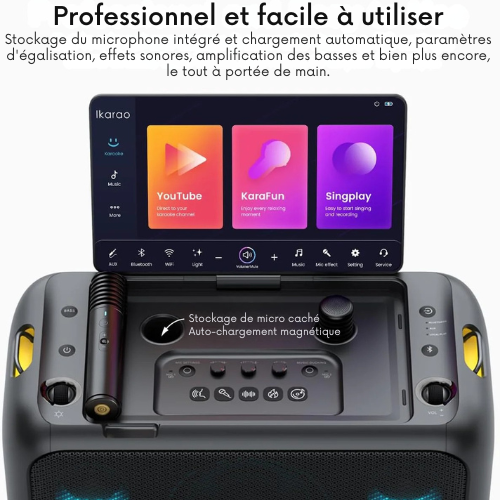 Profitez d’une expérience karaoké complète sans télévision. Recherchez vos chansons directement via l’application karaoké intégrée, suivez les paroles sur le grand écran ou diffusez facilement des vidéos et de la musique depuis YouTube. Tout est inclus dans un seul appareil.